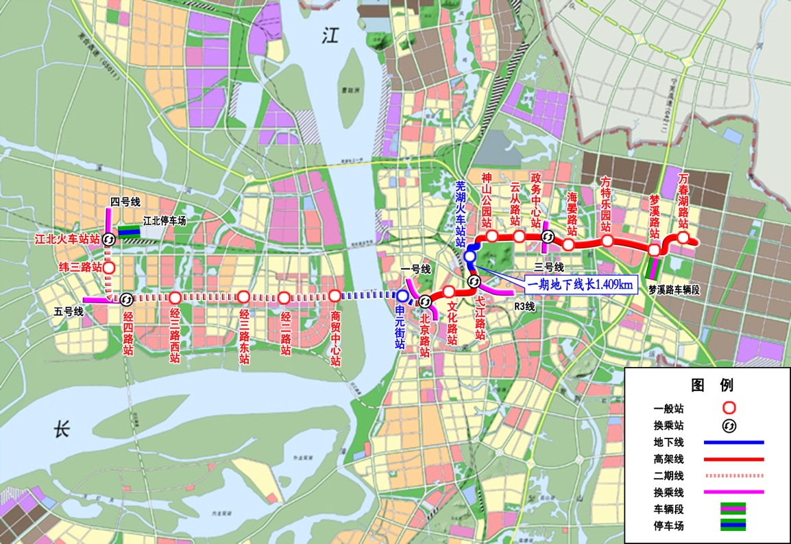 蕪湖市軌道交通1號線工程起于保順路站,終于白馬山站,呈南北走向,線路全長約30.460km,共設車站25座,全部為高架車站,其中換乘站3座。蕪湖市軌道交通2號線一期工程起于北京路站,終于萬春湖路站,呈東西走向,線路全長約15.796km,共設11座車站(高架站10座、地下站1座),換乘站3座。共設置停車場1處、車輛段2處, 2019年12月底建成,2020年1月初開通試運營,2021年正式運營。