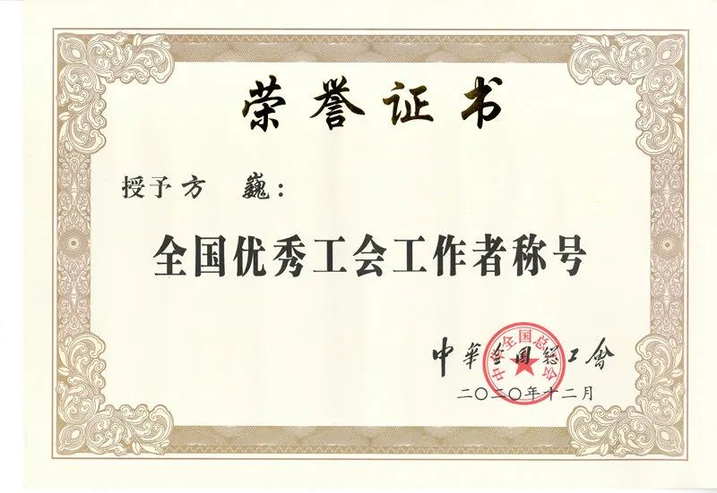 2020年獲中華全國總工會授予的“全國優秀工會工作者”稱號