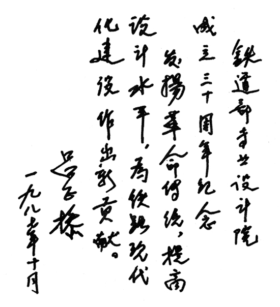 原全國政協(xié)副主席、鐵道部部長呂正操題詞(賀鐵道部專業(yè)設(shè)計(jì)院成立三十周年)