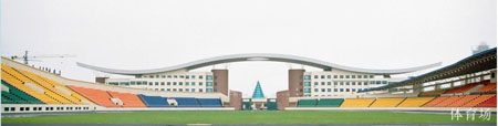 ②體育場: 總占地面積31000m2,國際比賽標準田徑、足球場,觀眾看臺座椅數14760座,附屬房屋建筑面積5227.43m2; 看臺雨篷最大懸挑長度14m。