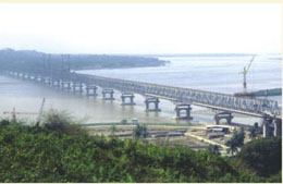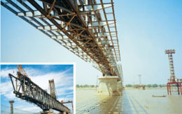 緬甸毛淡棉大橋-公鐵兩用大橋。該橋公路、鐵路在同一平面,主橋為7聯(lián)共21跨連續(xù)鋼桁梁,全長2345.6米,采用索塔懸臂拼裝法施工。