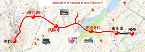 新建鄭州至焦作城際鐵路是中原城市群客運系統的建設項目之一,正線全長約77.8km,其中利用既有京廣線9.65km,新建線路68.15km,設計時速200km/h。全線設鄭州、南陽寨、黃河景區、武陟、修武、焦作6個車站。